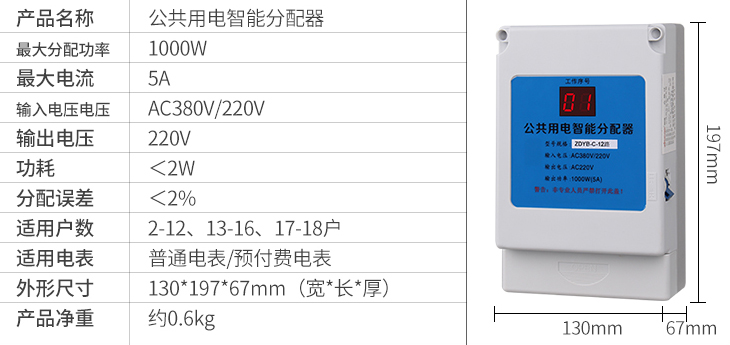 一、智盛牌公用電智能均分器”是將公共樓道用電所消耗的電能(如樓道燈,對講防盜門等),自動分配到各受益用戶的電表中。每天輪流接通一戶電表,開機(jī)通電時第一戶電表隨機(jī)產(chǎn)生,達(dá)到公平分?jǐn)傠娰M(fèi)的目的,本款特點(diǎn):外置保險絲更換方便,可實(shí)時顯示均分到哪戶。
