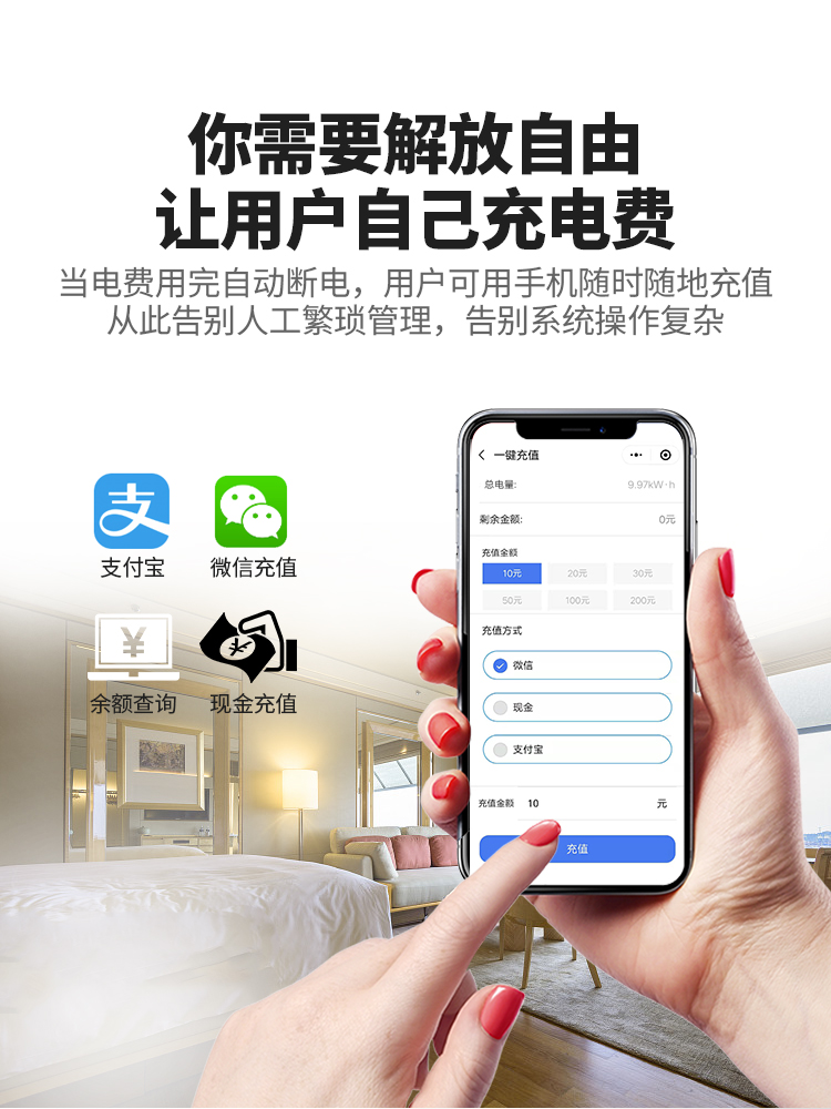 傳統(tǒng)的用電收費(fèi)方式需要統(tǒng)一抄表,然后回來(lái)計(jì)算電費(fèi),再上門(mén)收費(fèi)。勞動(dòng)力大,耗時(shí)多,收費(fèi)難,有的業(yè)主古意拖欠電費(fèi),或上門(mén)經(jīng)常碰到業(yè)主。以及后來(lái)更為科學(xué)一些的插卡式電表也存在諸多缺點(diǎn):業(yè)主的購(gòu)電卡易丟失,充值需要到物業(yè)管理處,需要配備專(zhuān)門(mén)的充值電費(fèi)的管理人員。